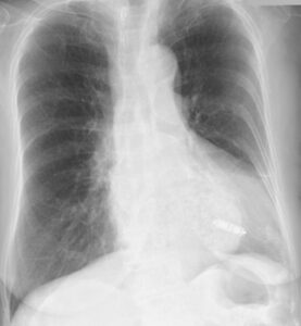 では、もう一つ。下のレントゲンもペースメーカが入っている患者さんのものですが、ペースメーカがどこにあるか分かるでしょうか?