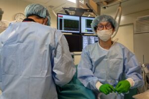 10分かからないうちに救急車は病院に到着しました。救急隊員が車内で点滴ルートを確保してくれて、胸骨圧迫を続けいていますが、まだ自己心拍は再開していません。あなたもERの看護師さんらとともに、手際よく胸骨圧迫を代ったり、薬剤投与を行います。